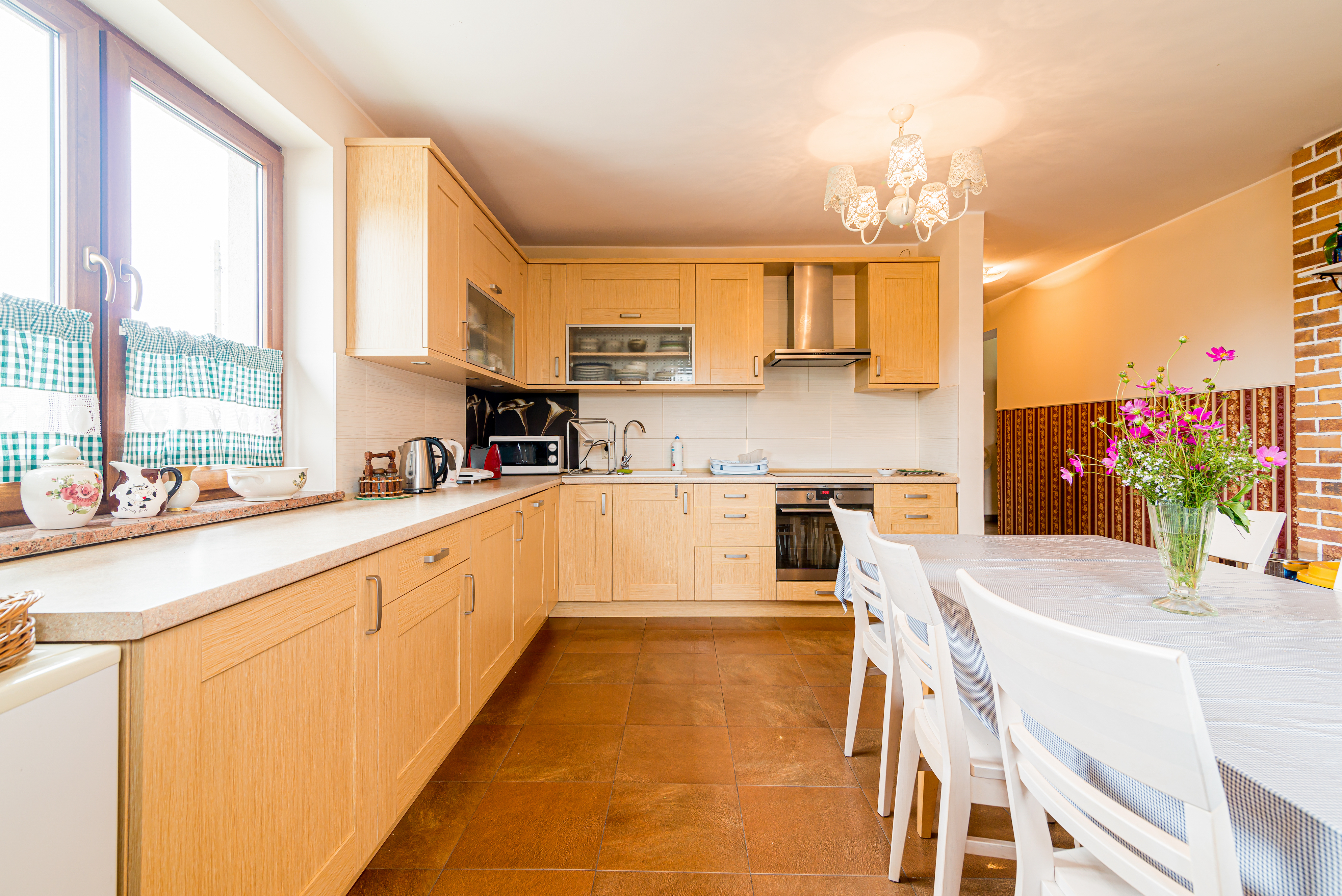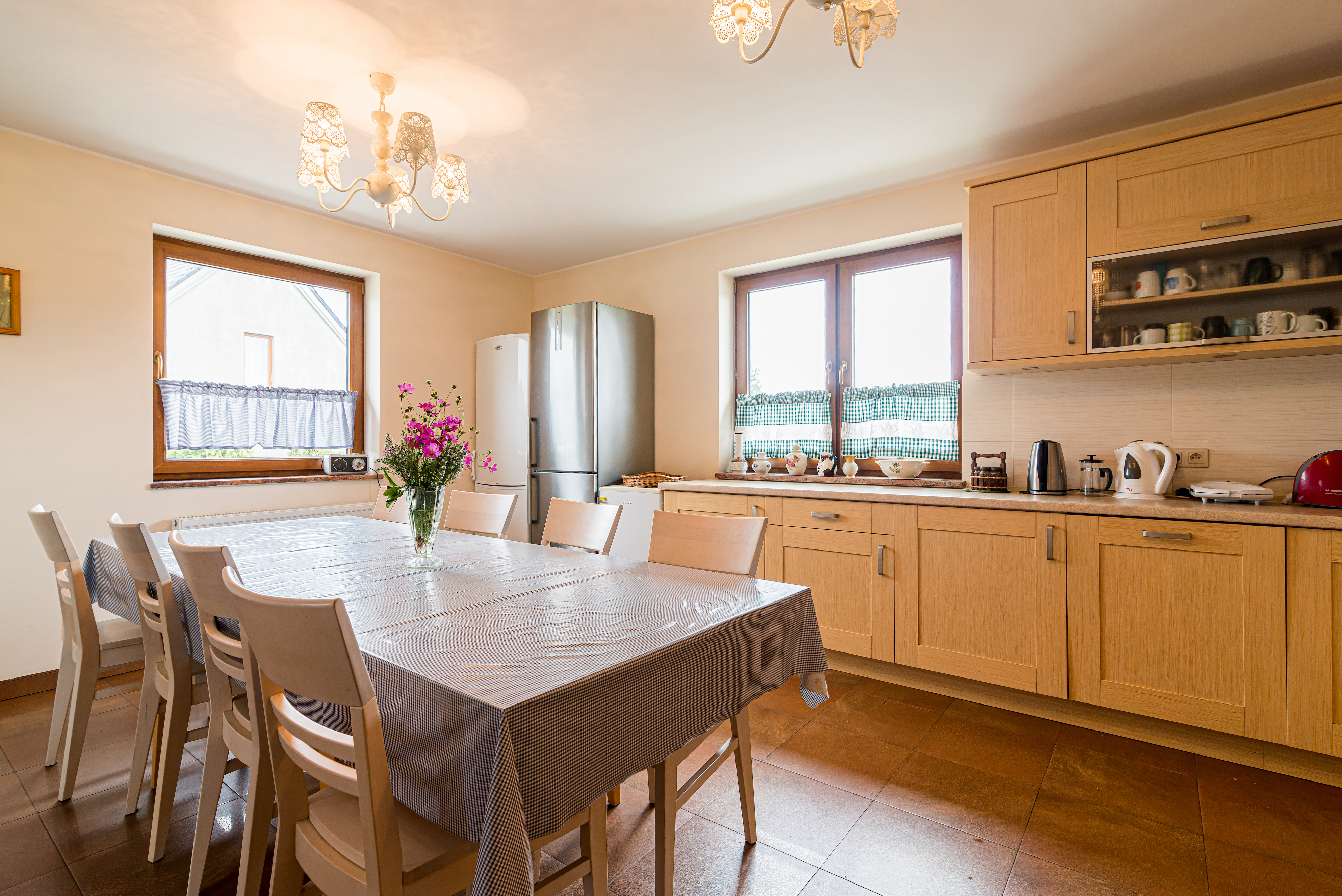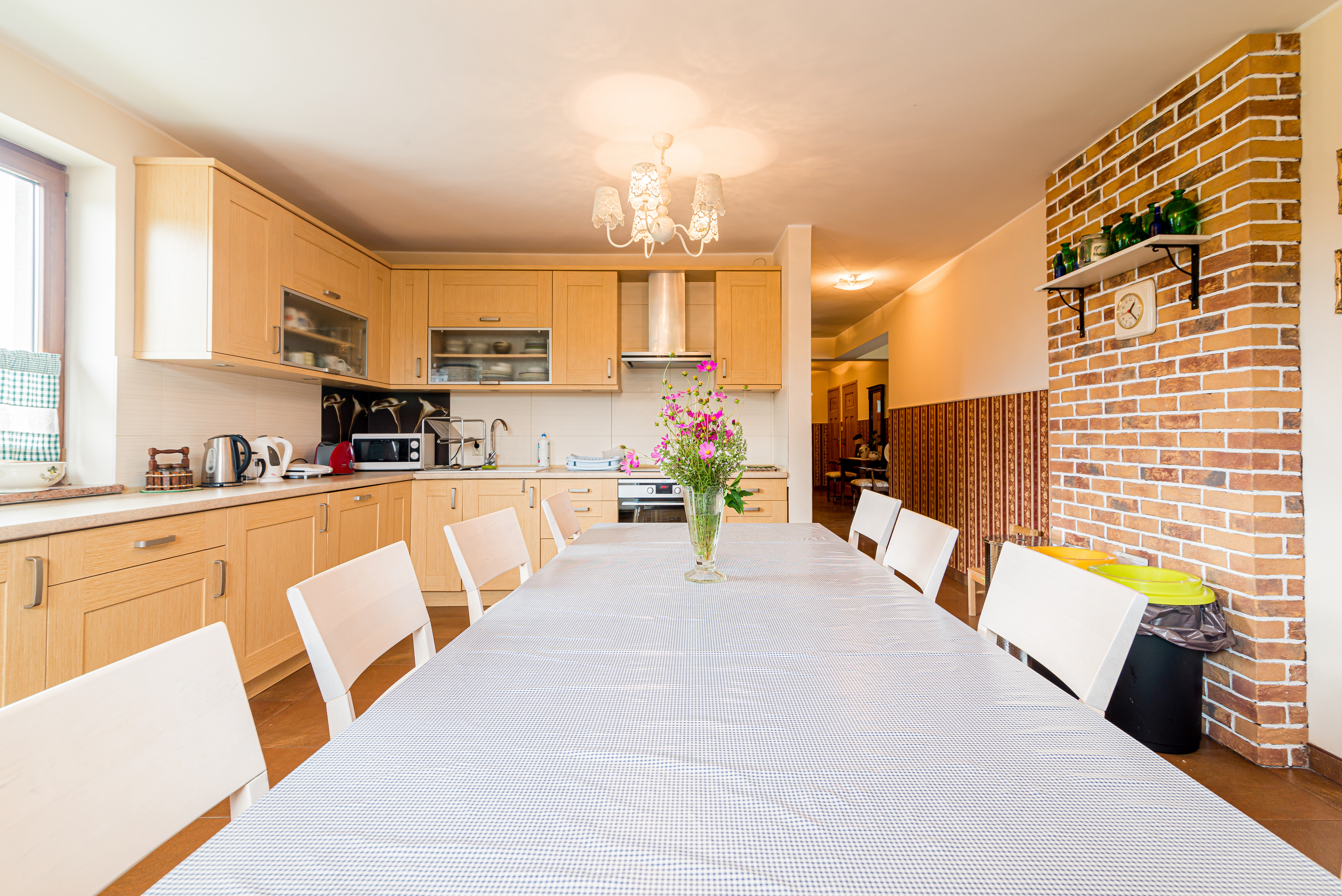 PARTER: Przestronny pokój dzienny z kominkiem, z wyjściem na ogród. Goście Bursztynowego Dworku mają swobodny dostęp do w pełni wyposażonej kuchni z jadalnią. Na parterze znajdują się trzy pokoje 2, 3 osobowe, które dzielą wspólną większą łazienkę.