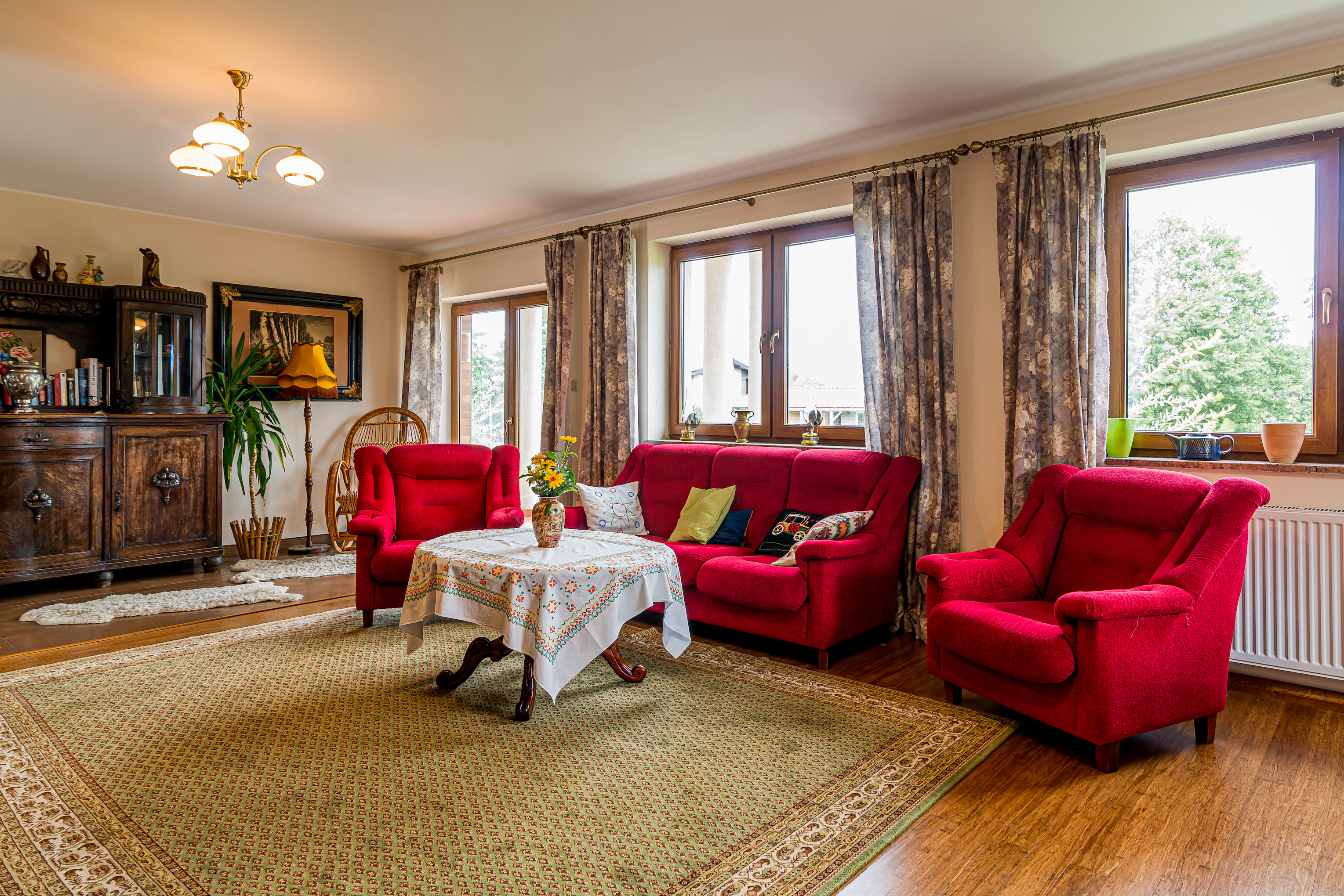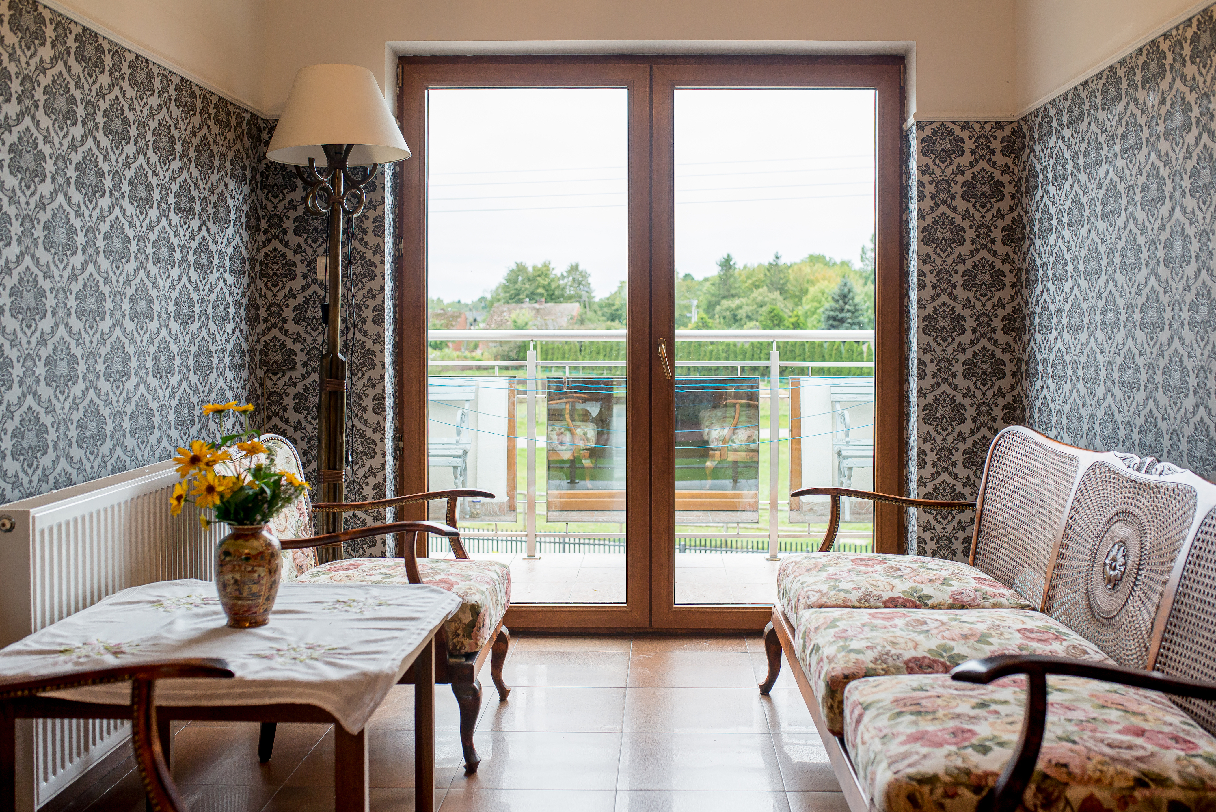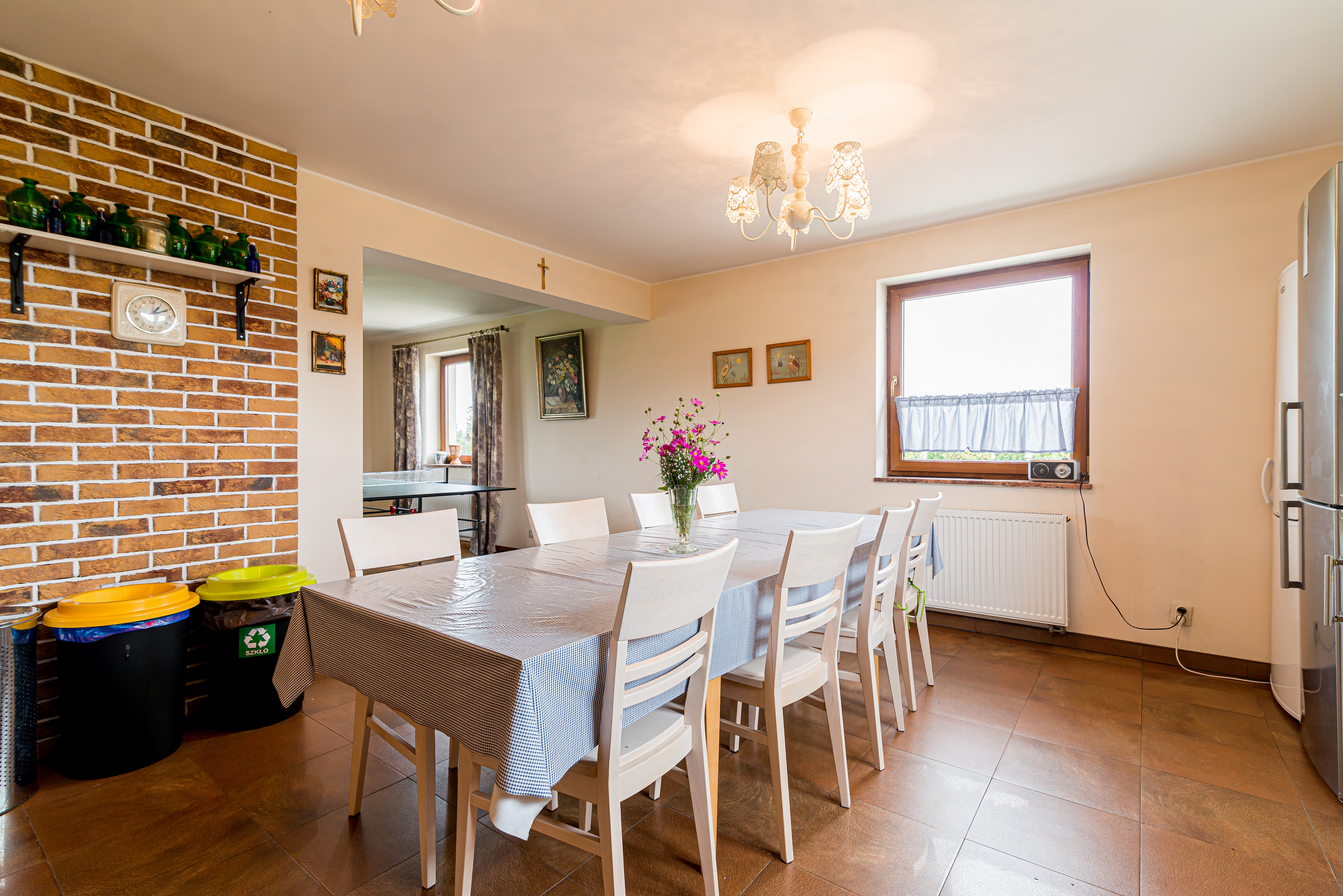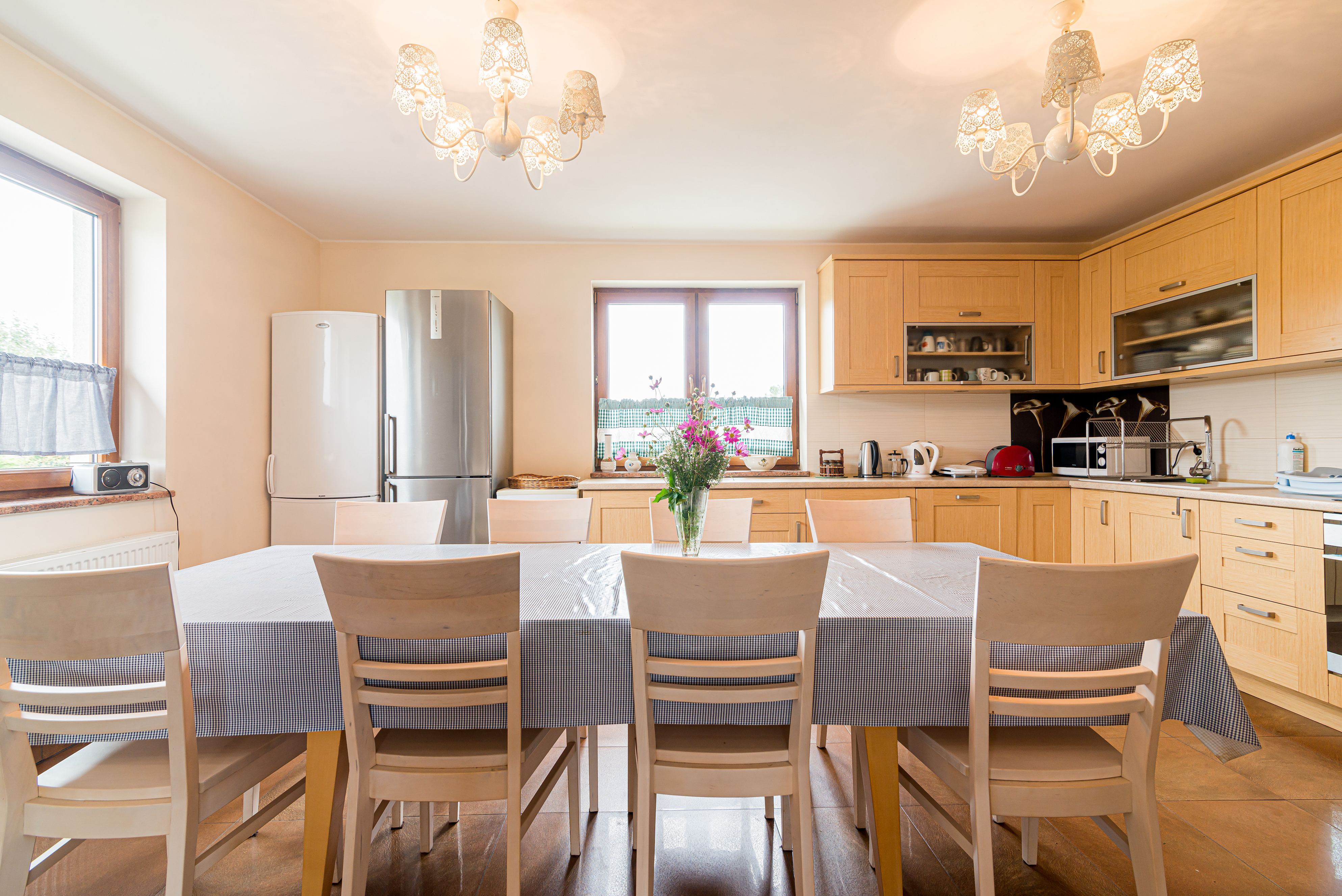 PARTER: Przestronny pokój dzienny z kominkiem, z wyjściem na ogród. Goście Bursztynowego Dworku mają swobodny dostęp do w pełni wyposażonej kuchni z jadalnią. Na parterze znajdują się trzy pokoje 2, 3 osobowe, które dzielą wspólną większą łazienkę.