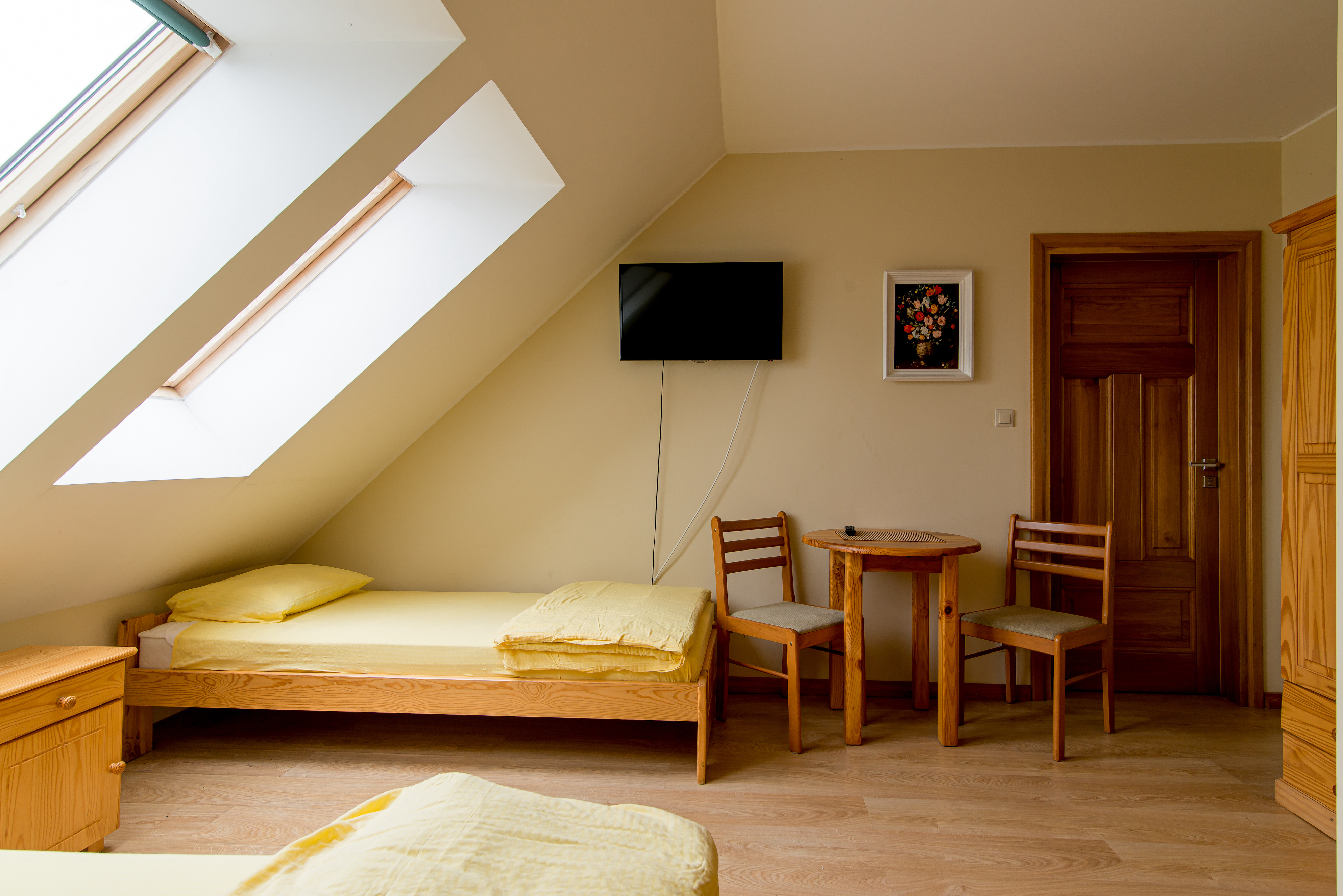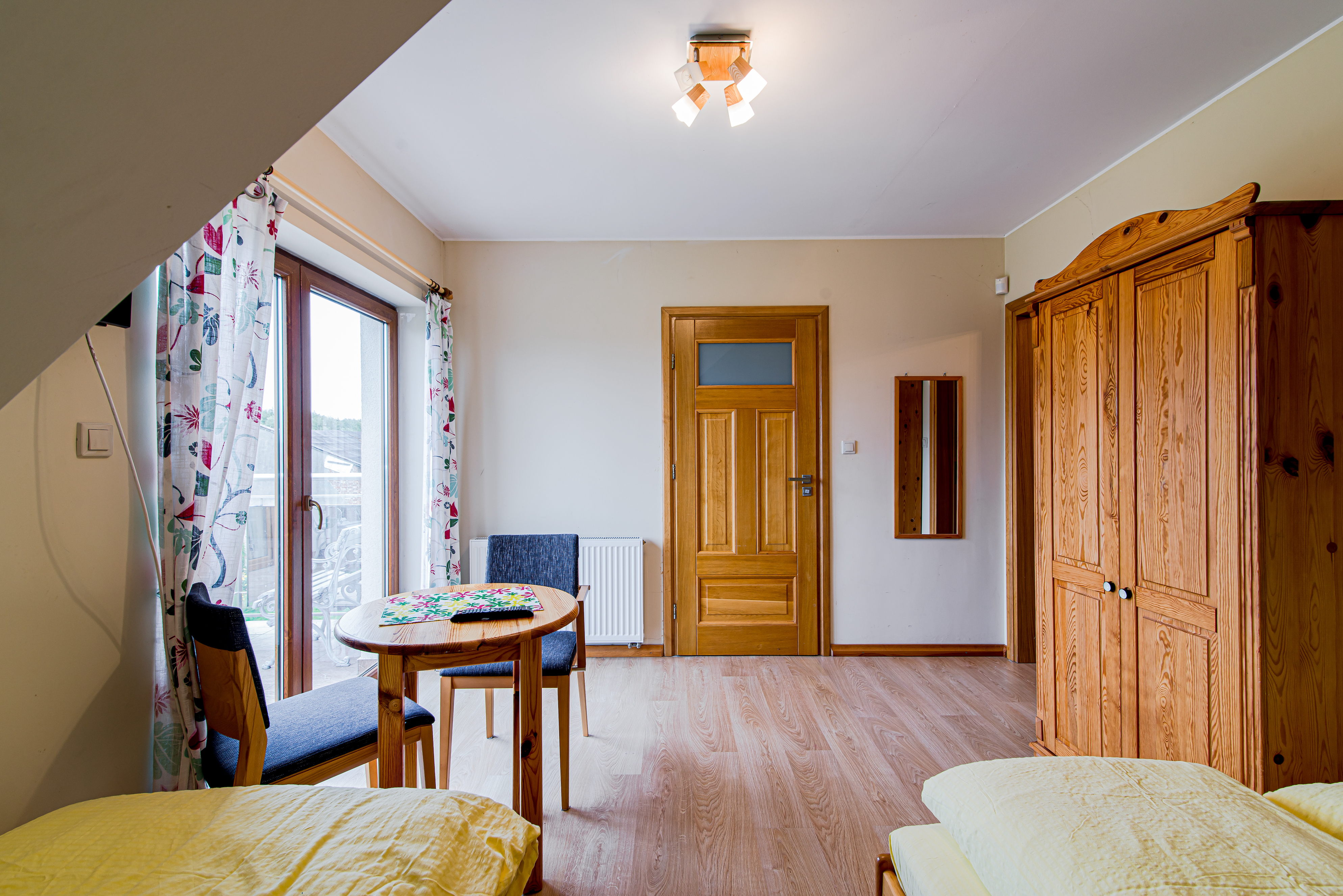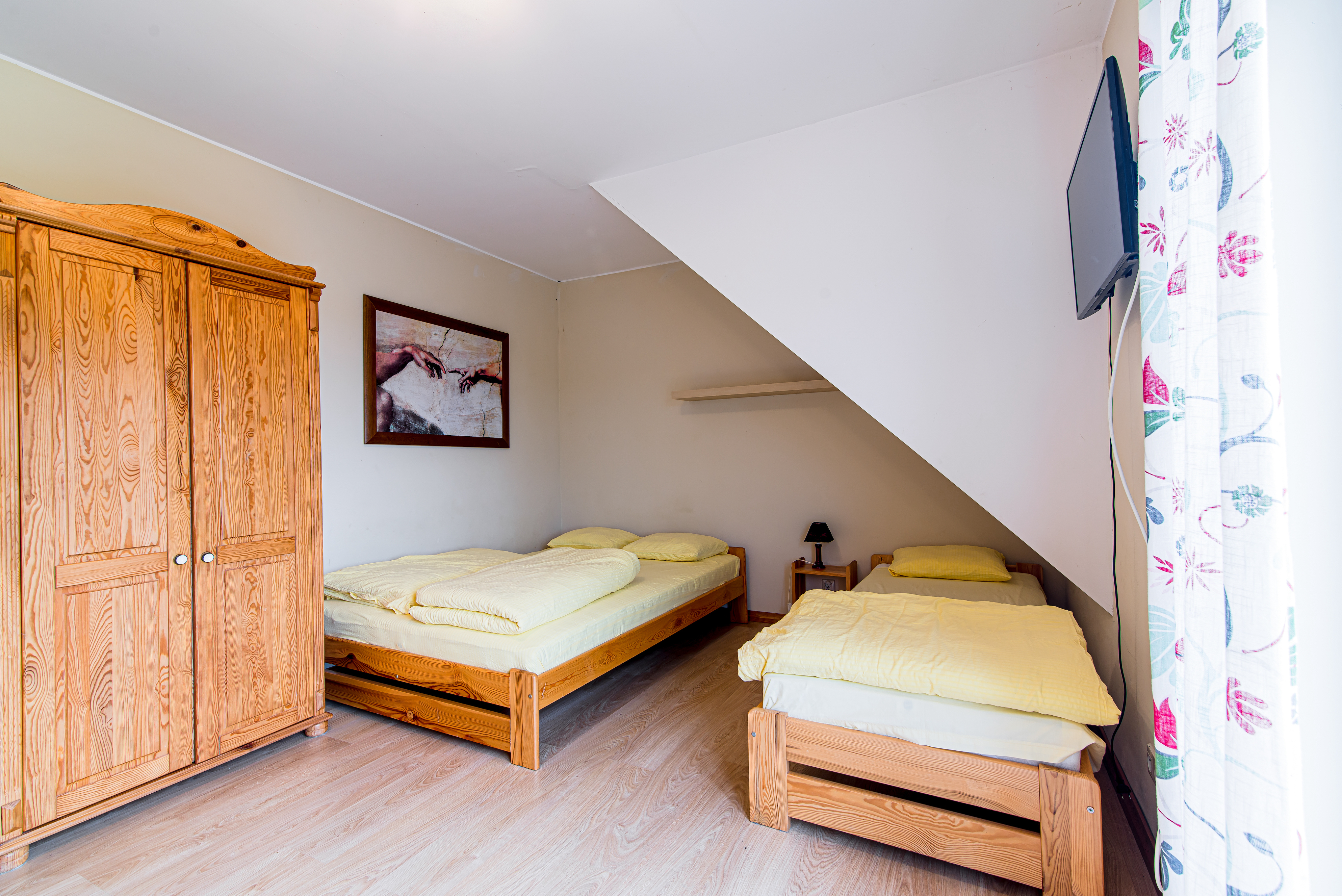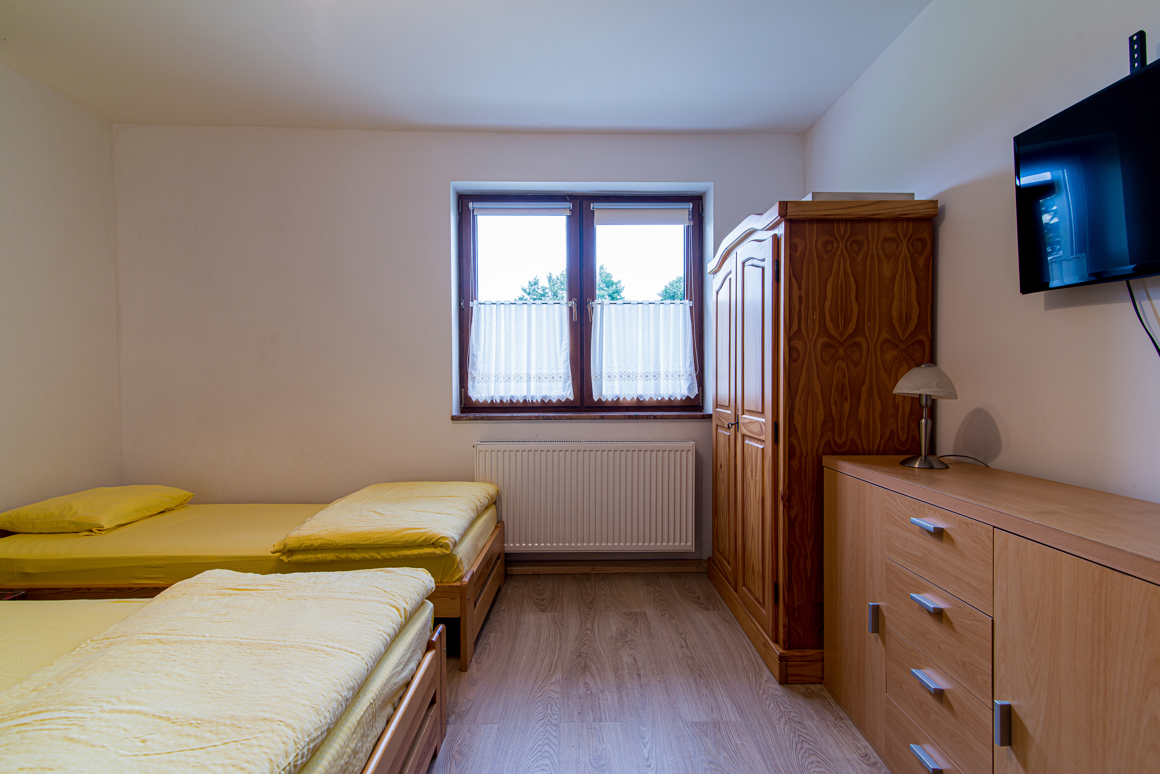 PIĘTRO: Przytulne pokoje: 2, 3, 4, 5 osobowe, każdy z własną łazienką z prysznicem. W każdym pokoju znajduje się telewizor ledowy, szafa na ubrania, lustro, krzesła i stolik. Do wspólnego użytku w holu znajduje się sofa i fotele wypoczynkowe oraz balkon, czajnik elektryczny, żelazko, deska do prasowania, suszarka do włosów.