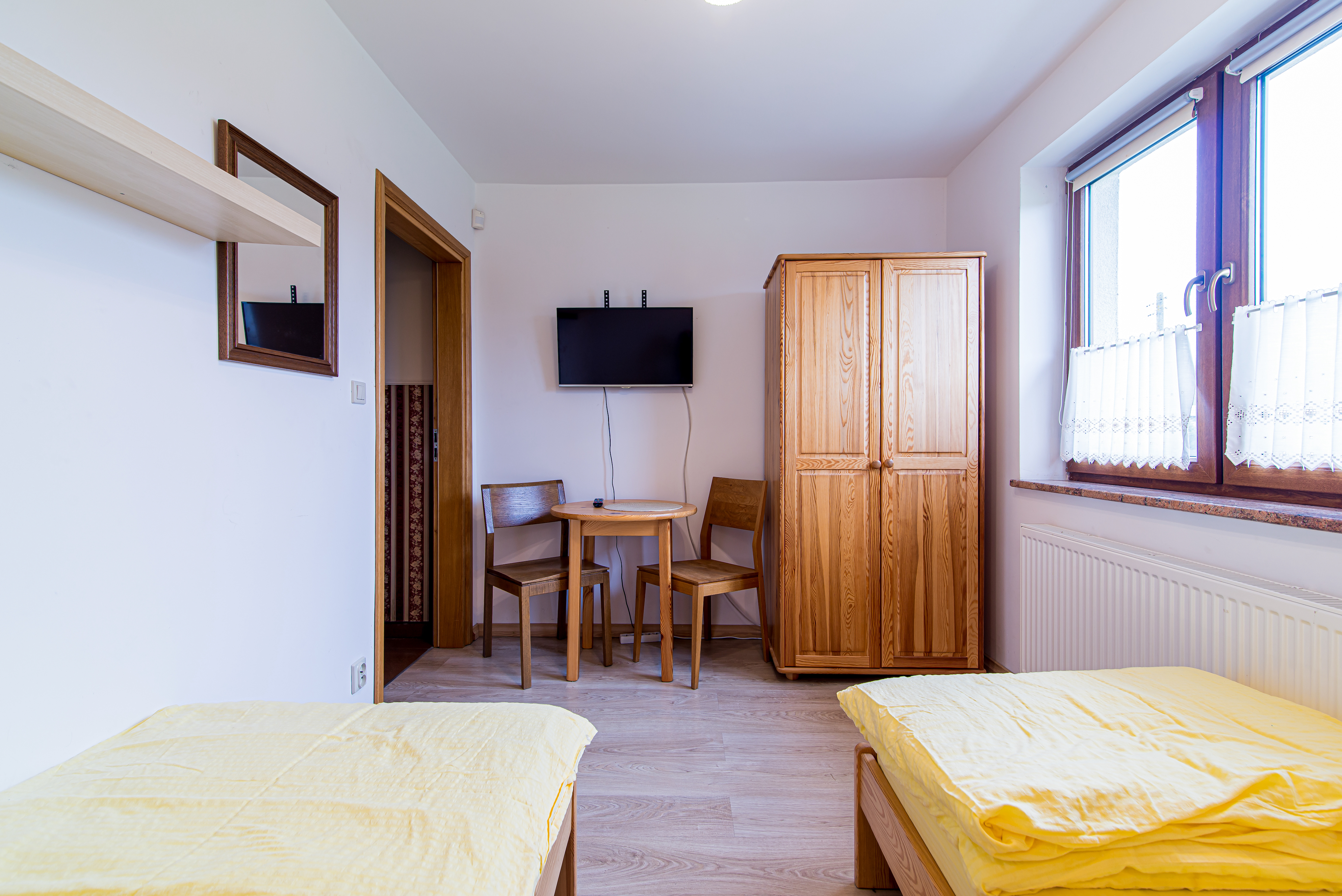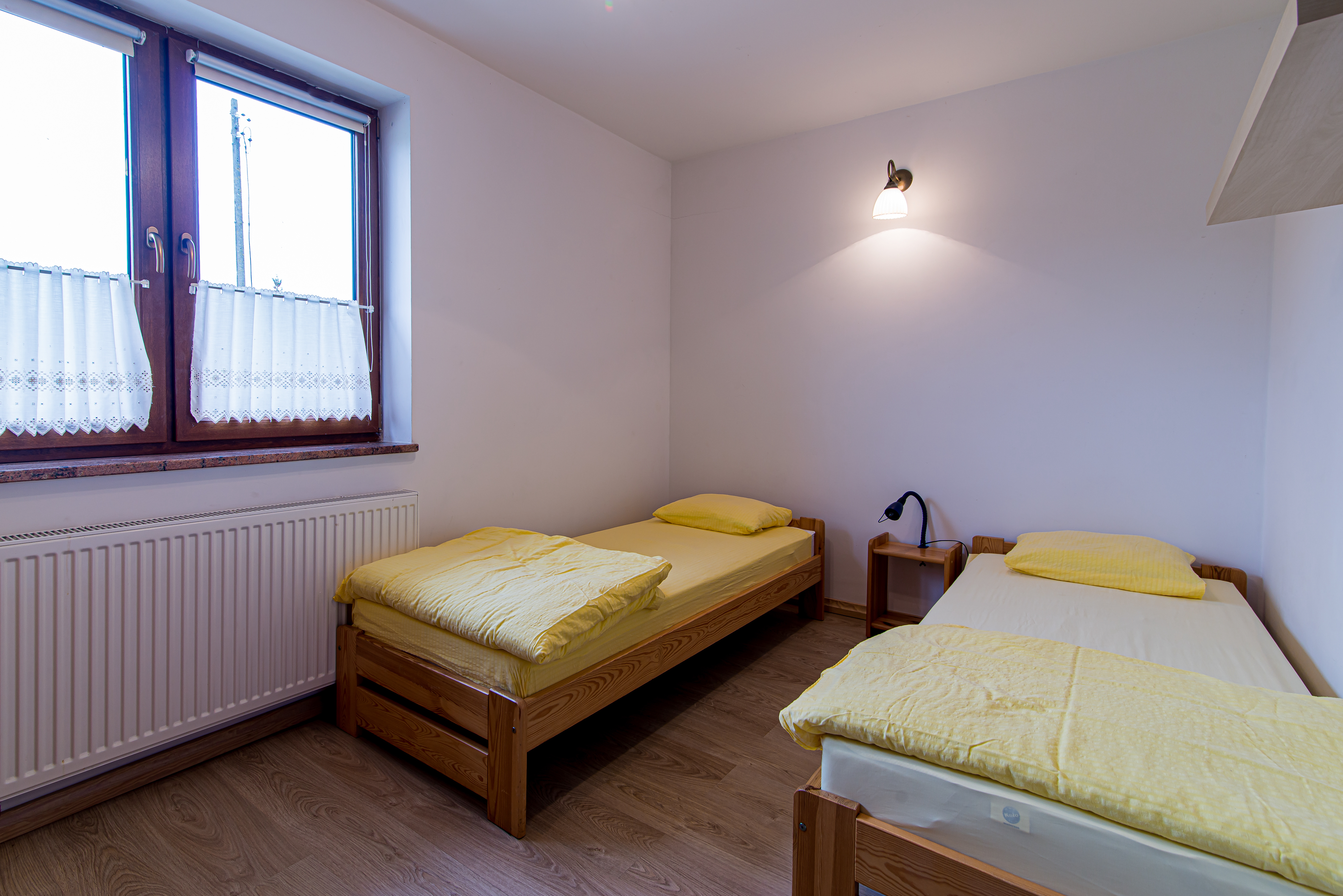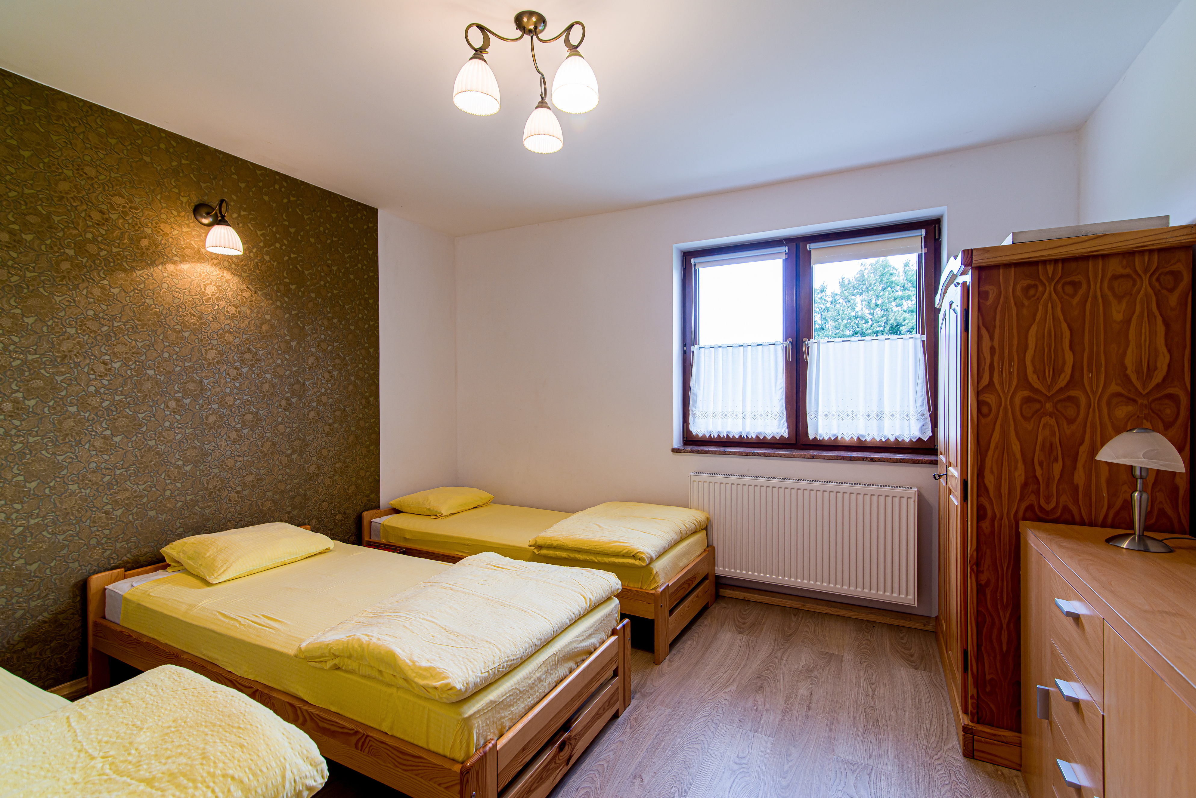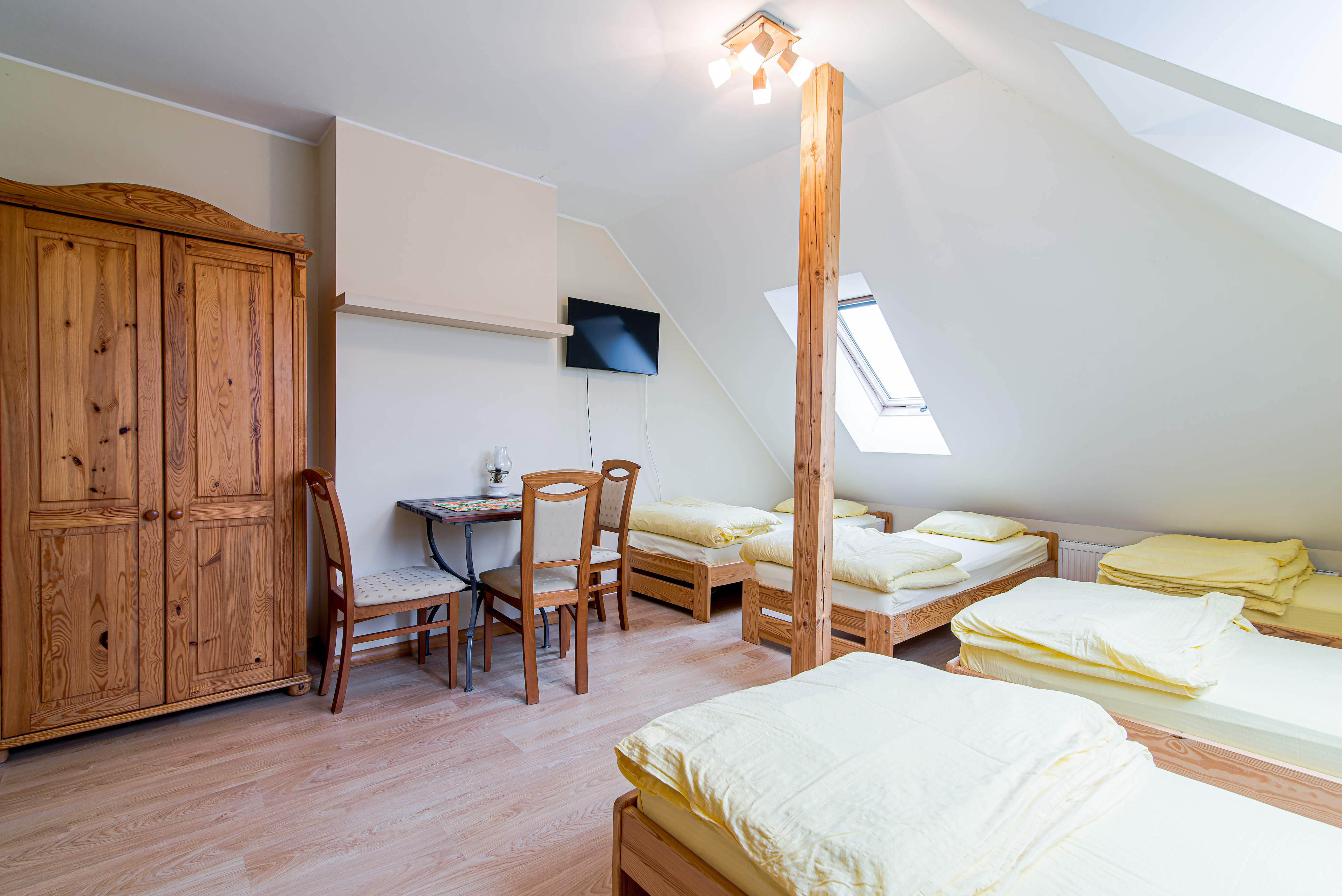 PIĘTRO: Przytulne pokoje: 2, 3, 4, 5 osobowe, każdy z własną łazienką z prysznicem. W każdym pokoju znajduje się telewizor ledowy, szafa na ubrania, lustro, krzesła i stolik. Do wspólnego użytku w holu znajduje się sofa i fotele wypoczynkowe oraz balkon, czajnik elektryczny, żelazko, deska do prasowania, suszarka do włosów.
