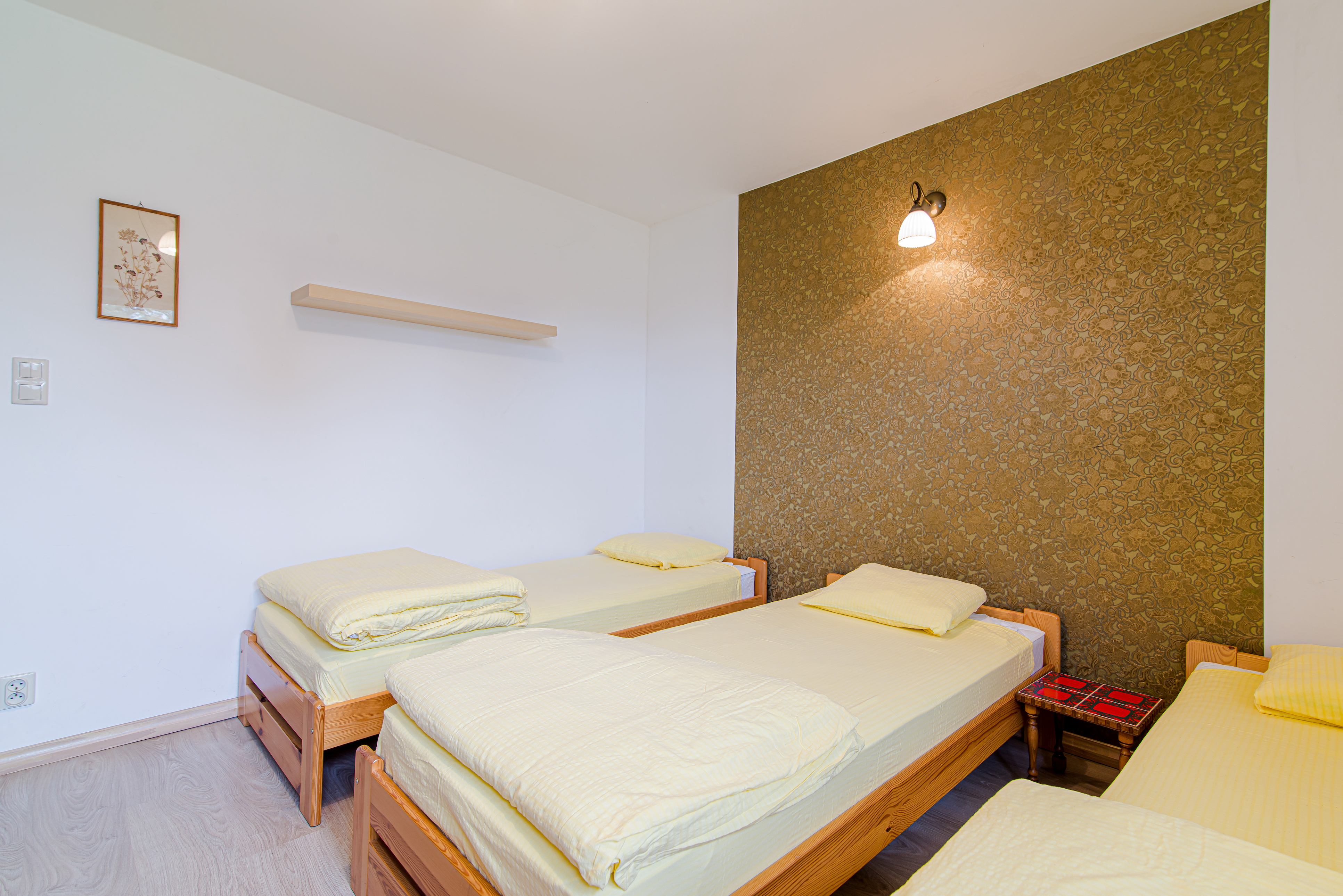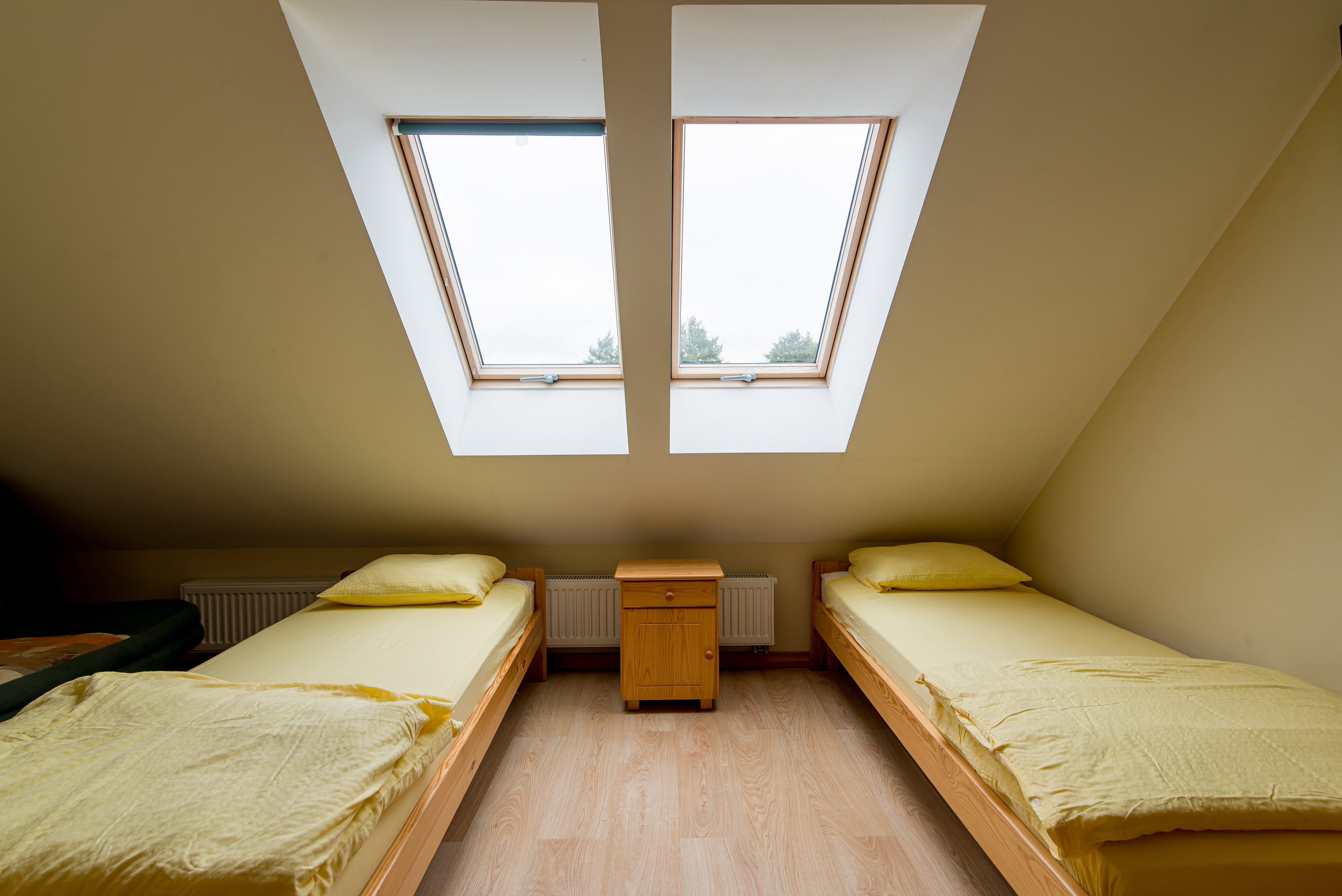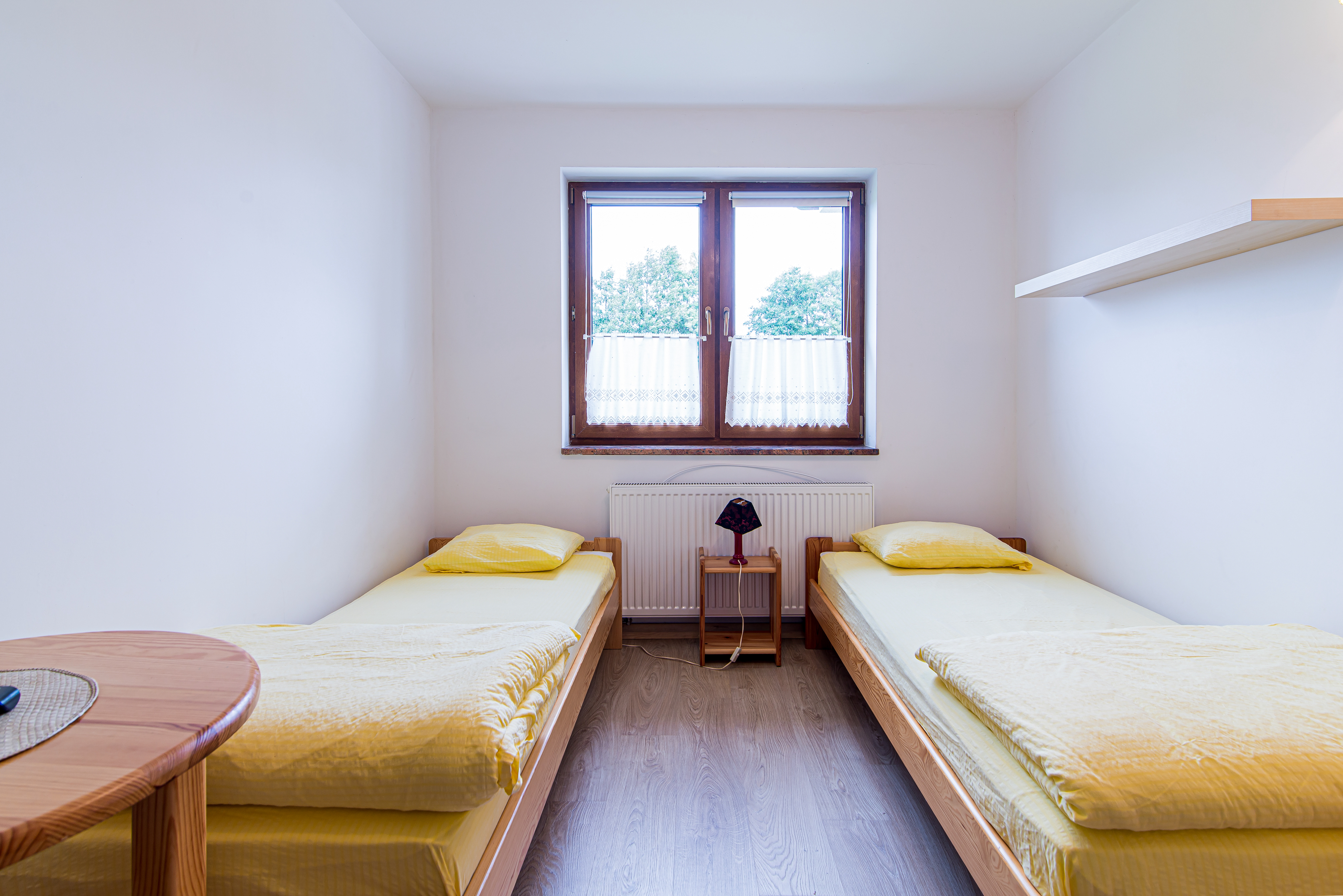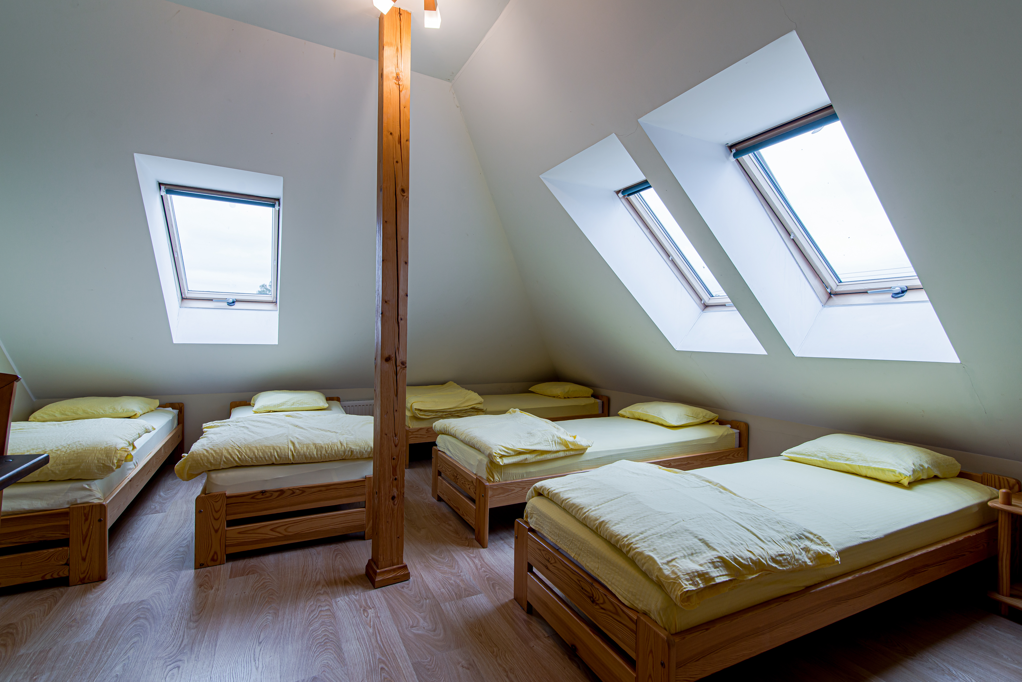 PIĘTRO: Przytulne pokoje: 2, 3, 4, 5 osobowe, każdy z własną łazienką z prysznicem. W każdym pokoju znajduje się telewizor ledowy, szafa na ubrania, lustro, krzesła i stolik. Do wspólnego użytku w holu znajduje się sofa i fotele wypoczynkowe oraz balkon, czajnik elektryczny, żelazko, deska do prasowania, suszarka do włosów.
