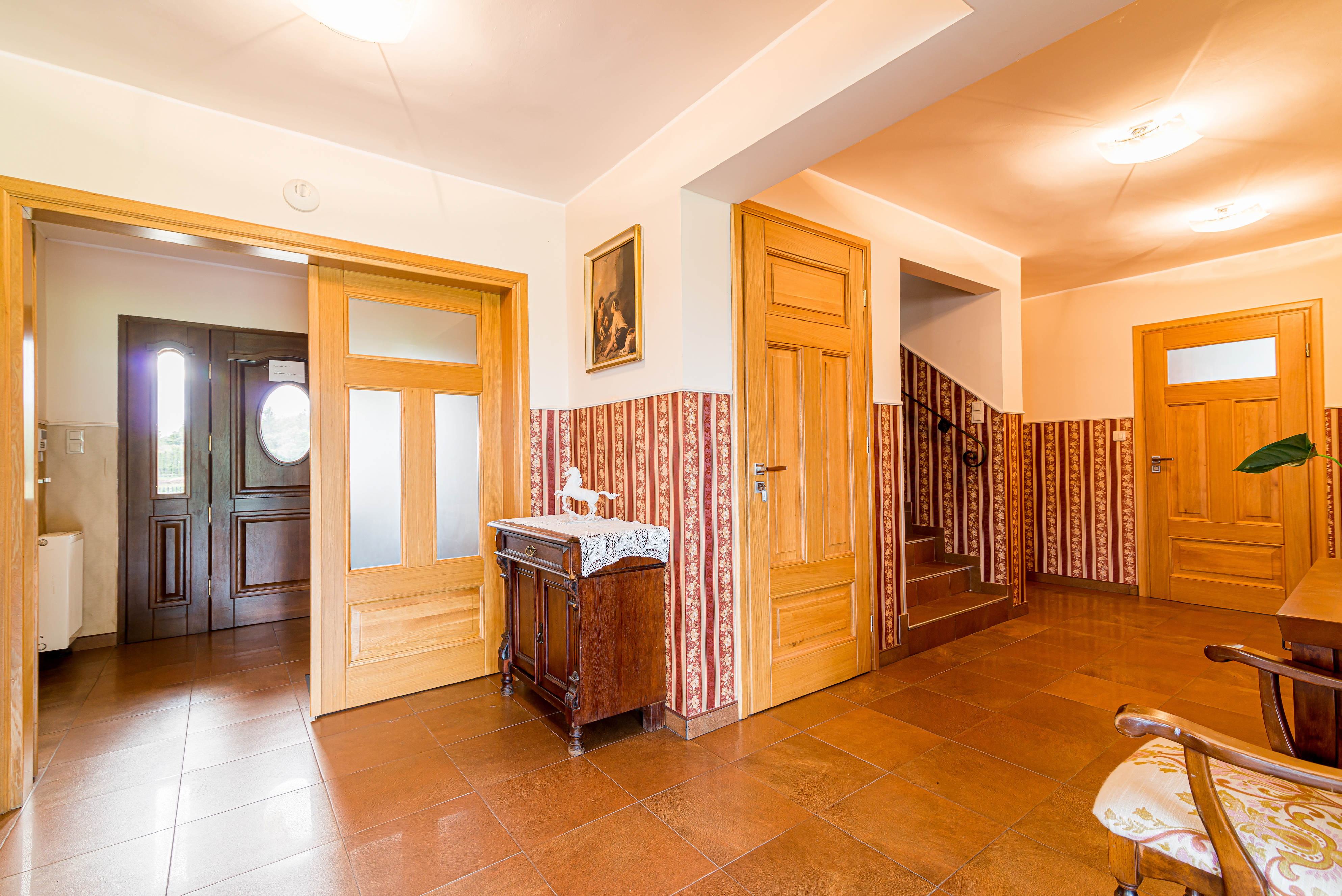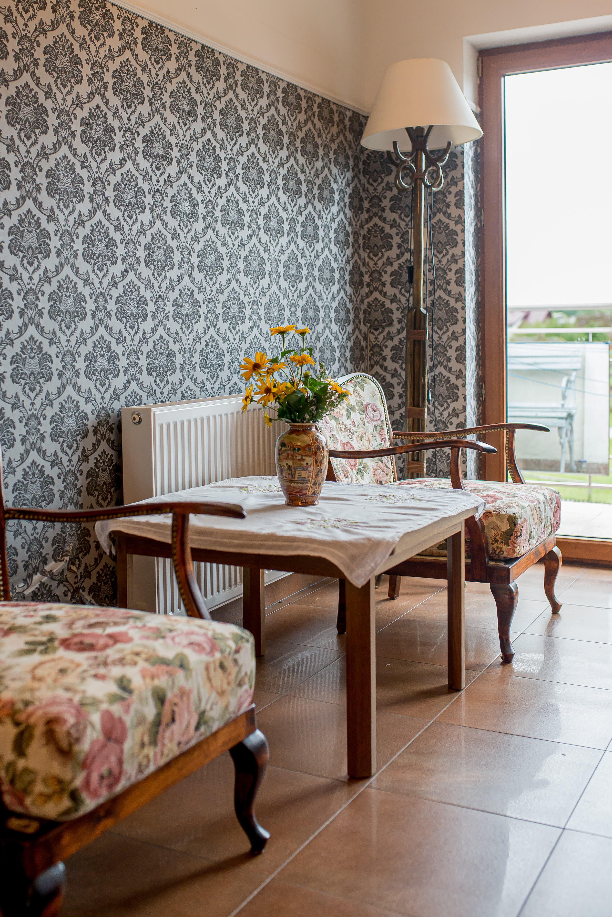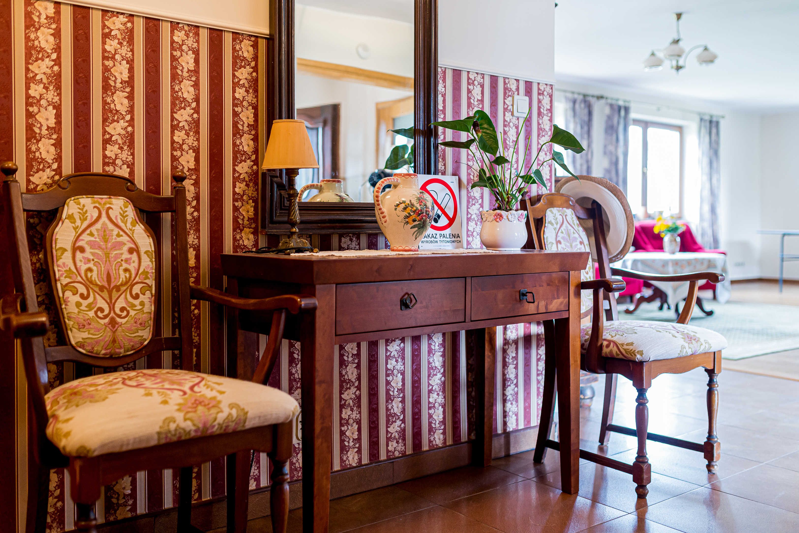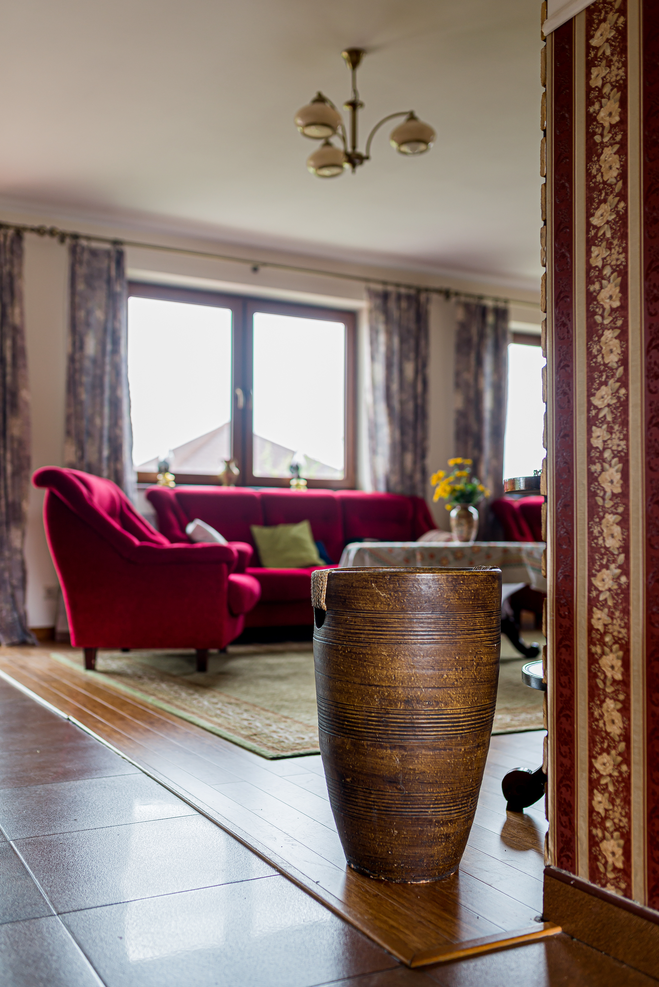 PIĘTRO: Przytulne pokoje: 2, 3, 4, 5 osobowe, każdy z własną łazienką z prysznicem. W każdym pokoju znajduje się telewizor ledowy, szafa na ubrania, lustro, krzesła i stolik. Do wspólnego użytku w holu znajduje się sofa i fotele wypoczynkowe oraz balkon, czajnik elektryczny, żelazko, deska do prasowania, suszarka do włosów.